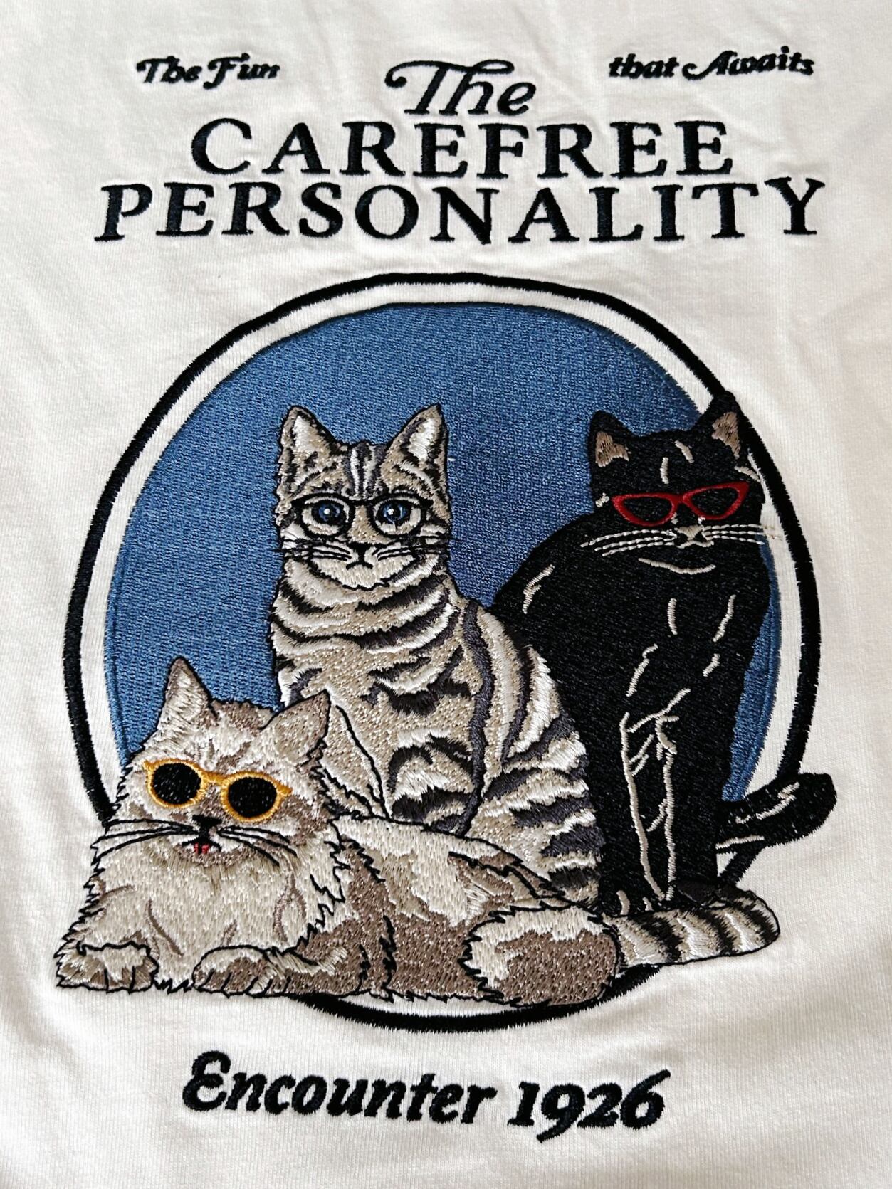 一方でバックにはサングラスをかけた猫たちのイラストを刺繍で大胆に施すことで対比が映える仕上がりとなります♡