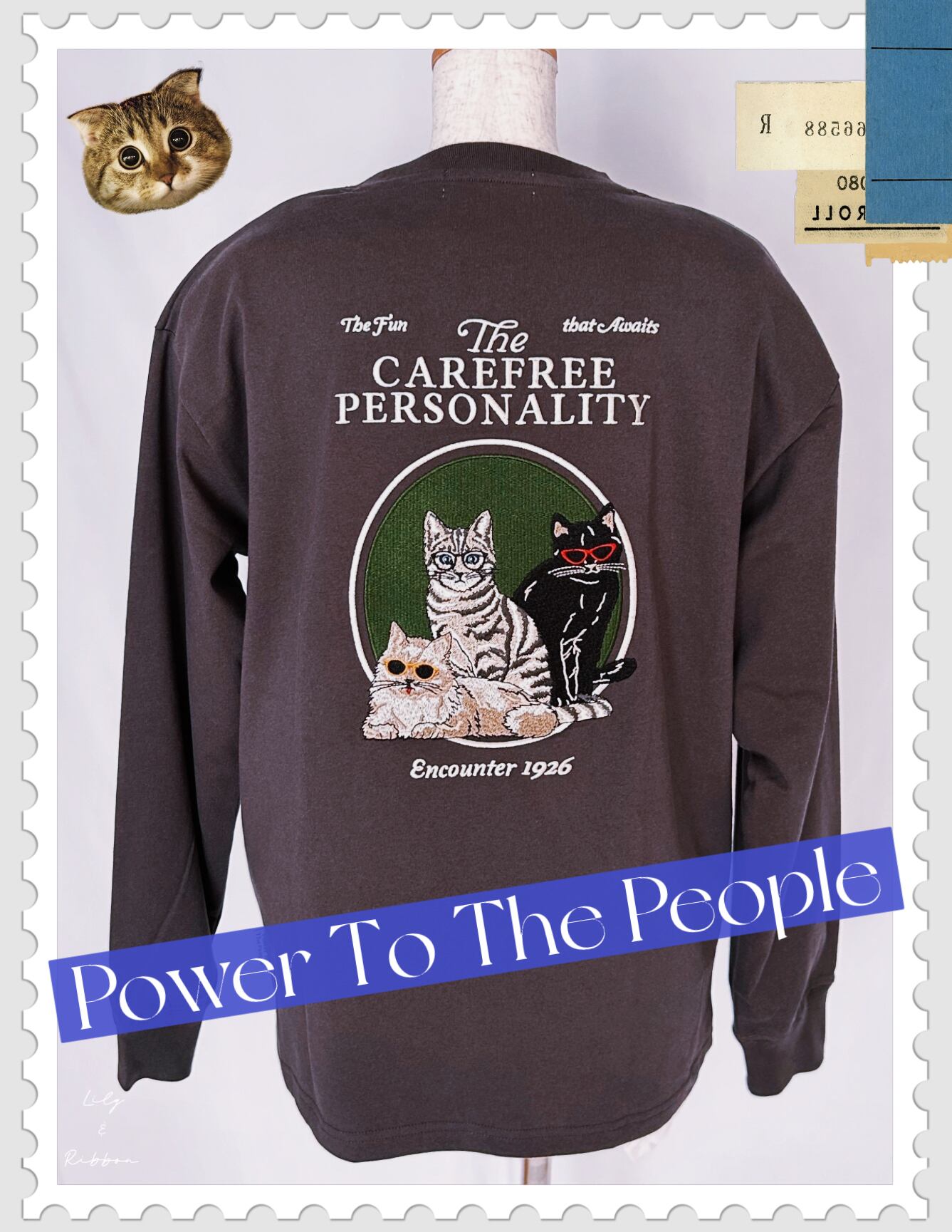 Power To The People パワートゥーザピープル ワンポイントロゴプリント&バックBIGイラスト 刺繍デザイン ロングスリーブTシャツ CAT ♡チャコール メンズ M 刺繍Tシャツ ロンT 猫