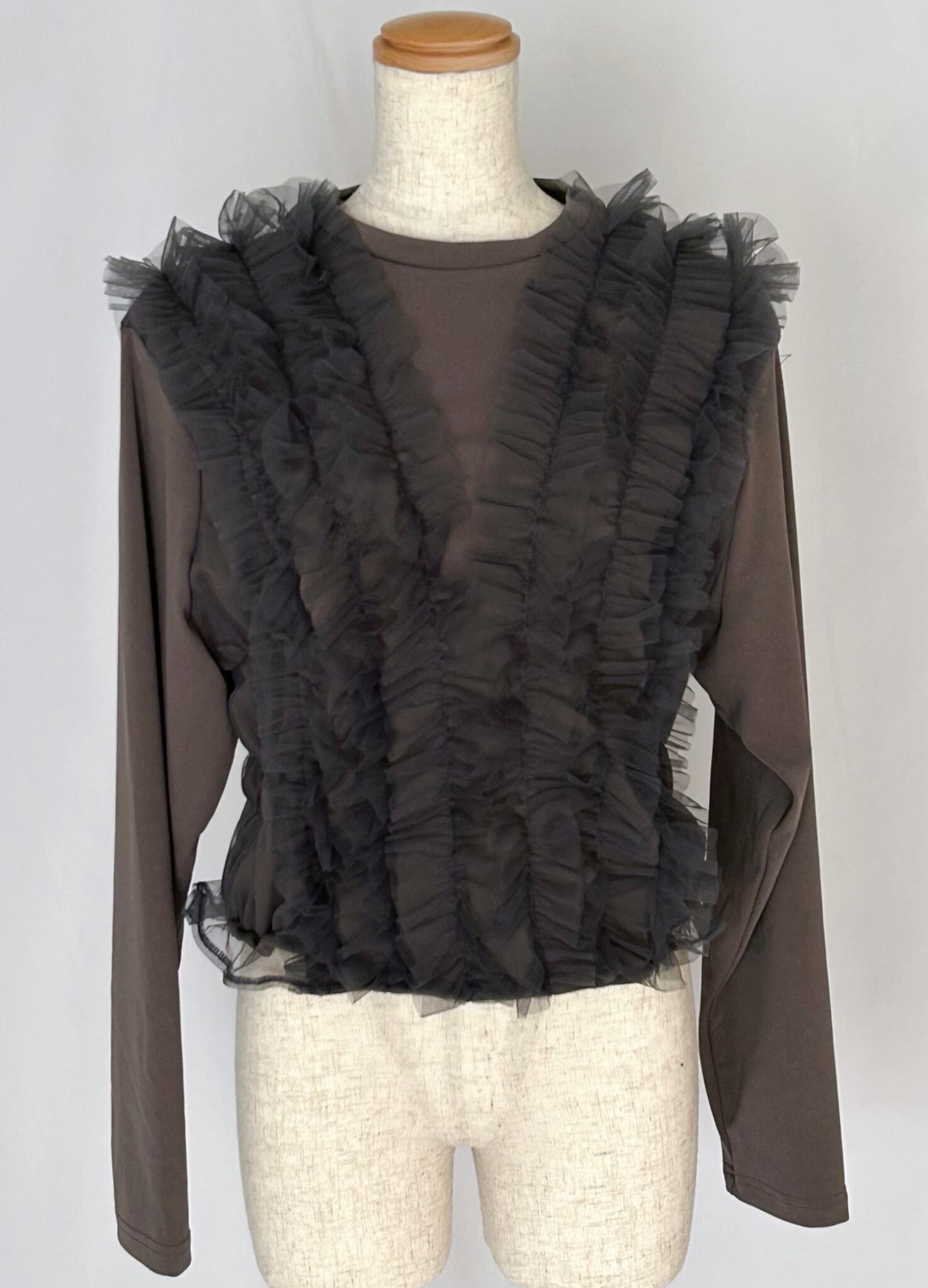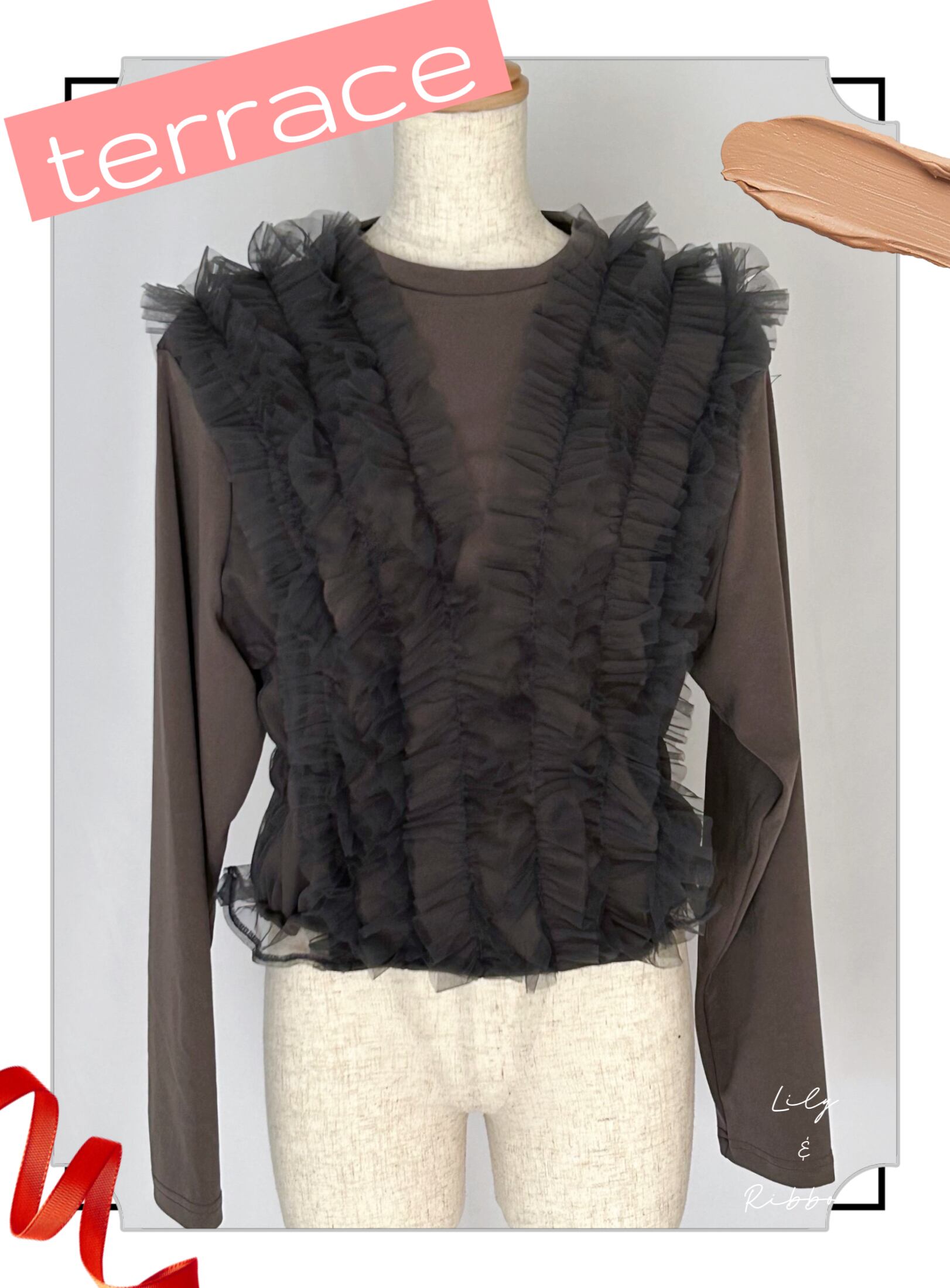 かわいい!terrace テラス チュールレースフリルドッキングカットソー チャコール♡秋 秋服 チュール フリル カットソー